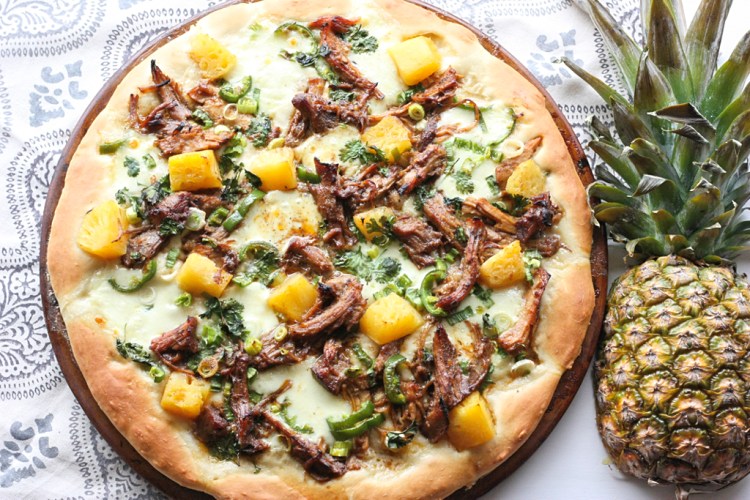 Up until now I’ve always rejected “Hawaiian” pizzas. Canadian bacon (aka wanna-be bacon) and I have never gotten along and therefore I never eat Canadian bacon and pineapple pizza, which is 99.9% of the Hawaiian pizzas on any given menu. Finally, though, I changed my tune. I guess the combination of homemade dough + slow cooked pork + fresh cut pineapple finally did it for me. And I mean really did it for me to the point where, if I could only eat this kind of pizza for the rest of my life I would absolutely be ok with it (as long as once in a while I could have a mushroom and onion truffled cream sauce pizza).