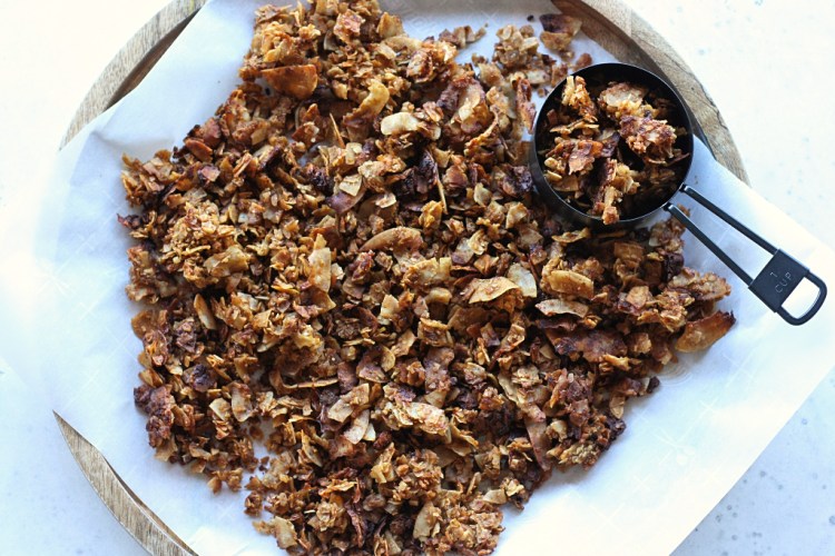 shaved brussels sprout salad with vegan bacon crumble and chive-garlic dressing