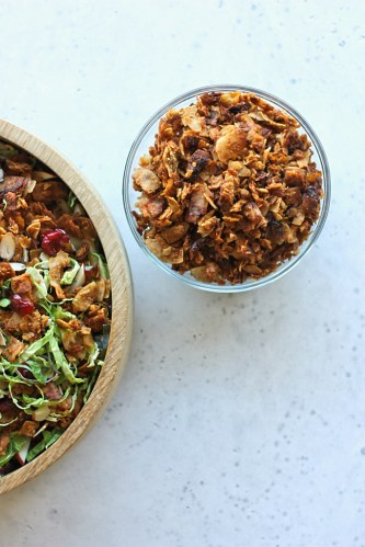shaved brussels sprout salad with vegan bacon crumble and chive-garlic dressing