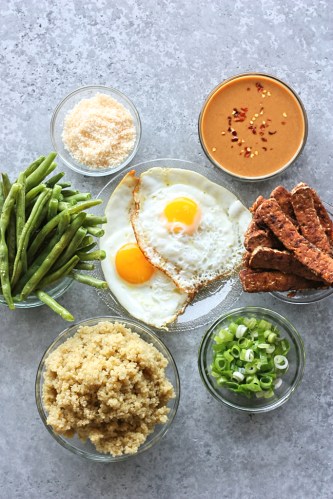 hearty vegetarian protein bowls with garlic sesame peanut sauce