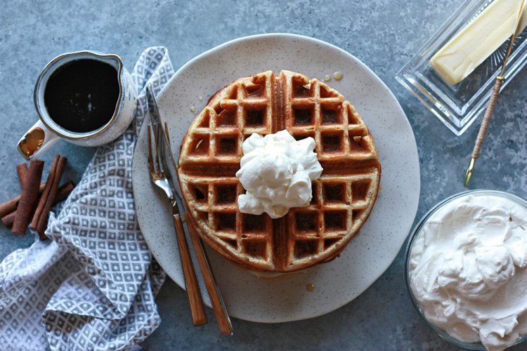 spiced buttermilk waffles with maple mascarpone whipped cream