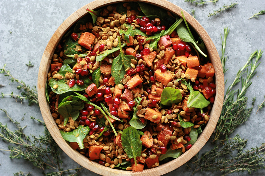 green salad with roasted sweet potato, pomegranate, toasted umami pepitas, and a creamy lime dressing