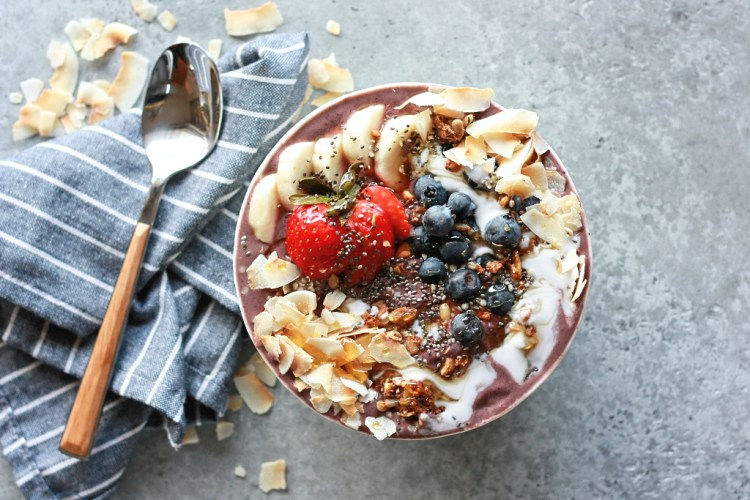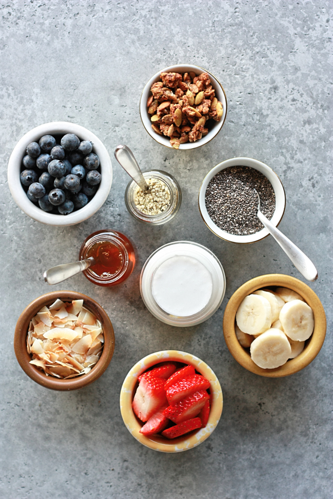 topping inspiration: swirl of full-fat coconut milk, coconut flakes, honey, chia seeds, fresh blueberries, fresh strawberries, fresh banana, edible flowers, granola, mango, kiwi, raspberry, hemp seeds, or practically anything you’d like