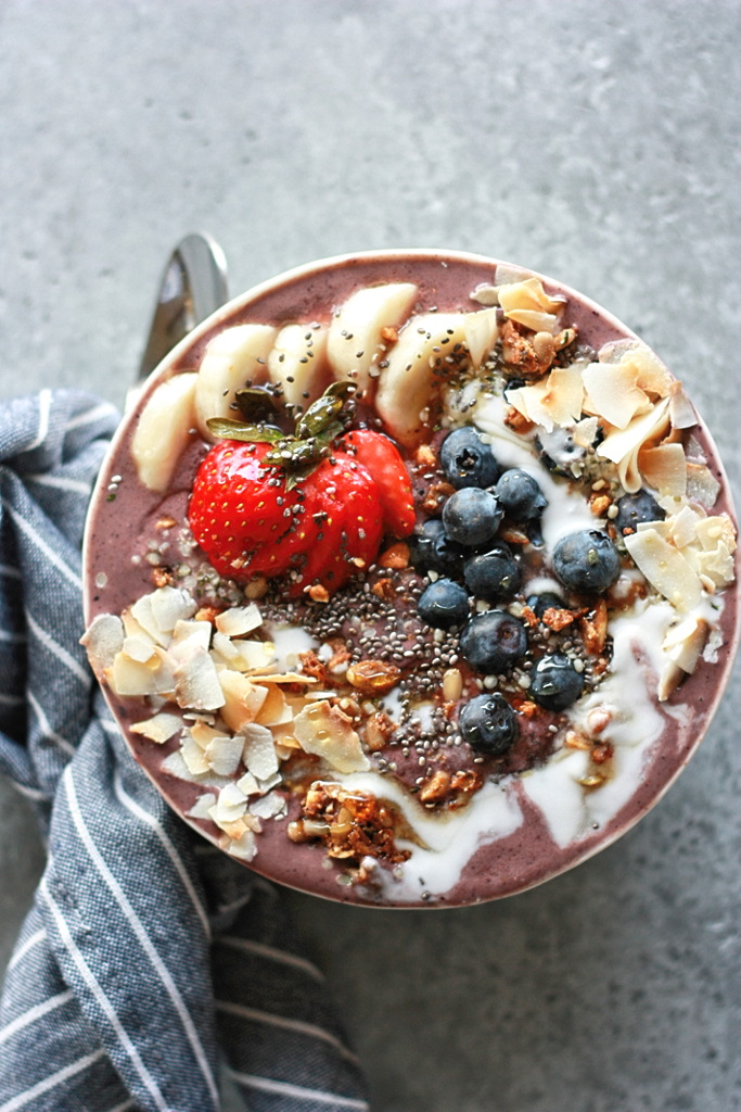 It’s mid-July and finally warm enough in the Pacific Northwest to enjoy acai bowls. I experimented with this recipe about six months ago, and why on earth I decided to make frozen snacks in the dead of winter I’ll never know. Maybe it’s because I had warmer climates on the mind. Nevertheless, I was able to come up with something reminiscent of my favorite Hawaiian acai bowls – not too icy, not too soupy, and with lots of toppings. I love adding almond butter and yogurt for some extra protein. You could even add protein powder if you like, or blend in some hemp and chia seeds. Regardless, it’s a fun and easy summer treat which I hope you’ll enjoy, especially if you have never had one before!