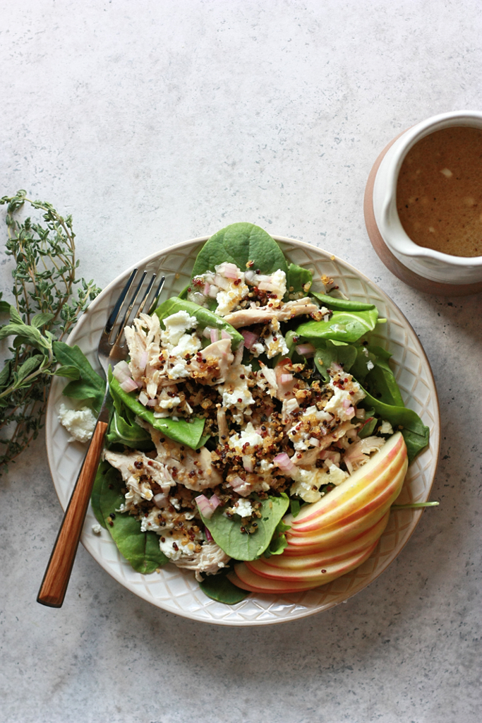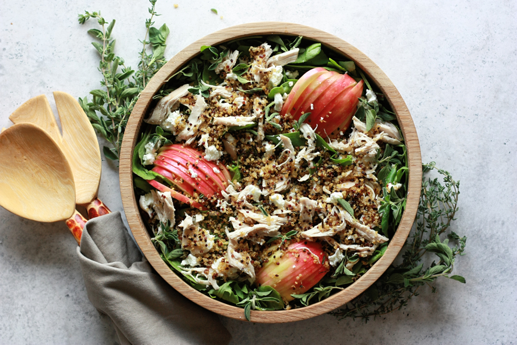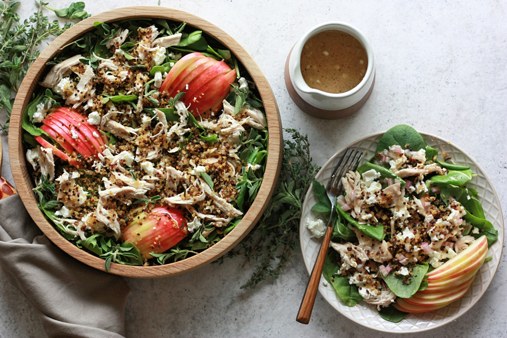 HARVEST SALAD WITH CHICKEN, APPLE, GOAT CHEESE, TOASTED HERBED QUINOA, AND A CIDER DRESSING