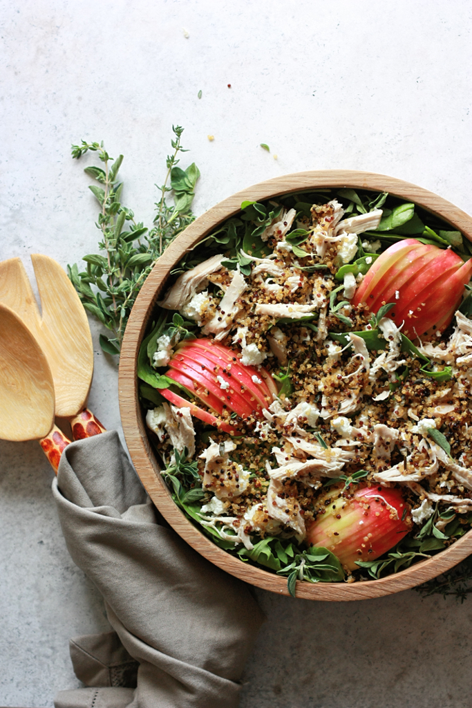- Assemble: Add the hearty greens to a large bowl and toss with the chopped chives and chopped oregano. Sprinkle on the toasted quinoa, shredded chicken, diced apple, and goat cheese. Toss with desired amount of dressing and serve. This salad is best the first day, though the dressing will keep well for roughly a week and can be made ahead.