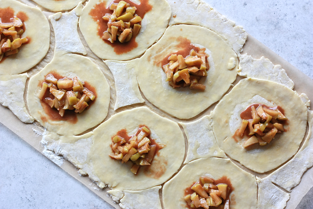 - Roll the dough out into a 20” x 10” rectangle. This should equal enough space for you to cut two rows of four dough circles. Cut eight 5” rounds of dough with a sharp knife (they don’t have to be exact circles). Brush a 1” strip of egg around the edge of each circle. Spoon the apples and caramel into the center of the 8 circles. Fold each dough circle in half and pinch the edges together firmly. Take a fork and firmly press indentations along the edge. See my photos above for reference, if needed.