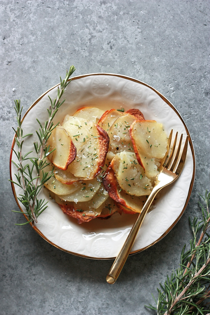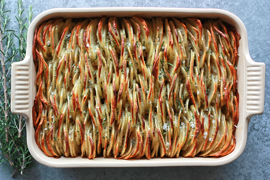 - Roast the potatoes in the oven for 1 hr and 15 min, until the tops of the slices are crispy. Before serving, garnish with additional chopped rosemary and a generous sprinkling of flaky salt.