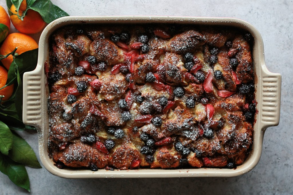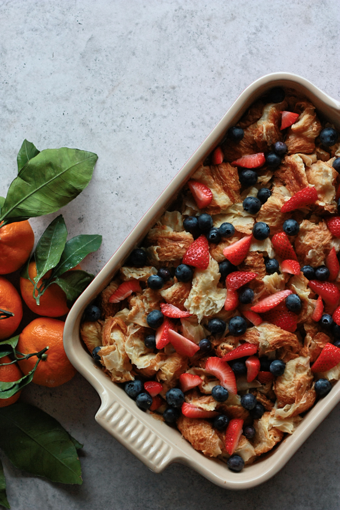 2. In a large bowl, whisk together the eggs, milk, cream, syrup, vanilla, cinnamon, nutmeg, salt, and orange zest. Pour the milk and egg mixture over the croissants and toss gently in the dish with a large spoon. Sprinkle a few handfuls of berries over the top of the croissants.