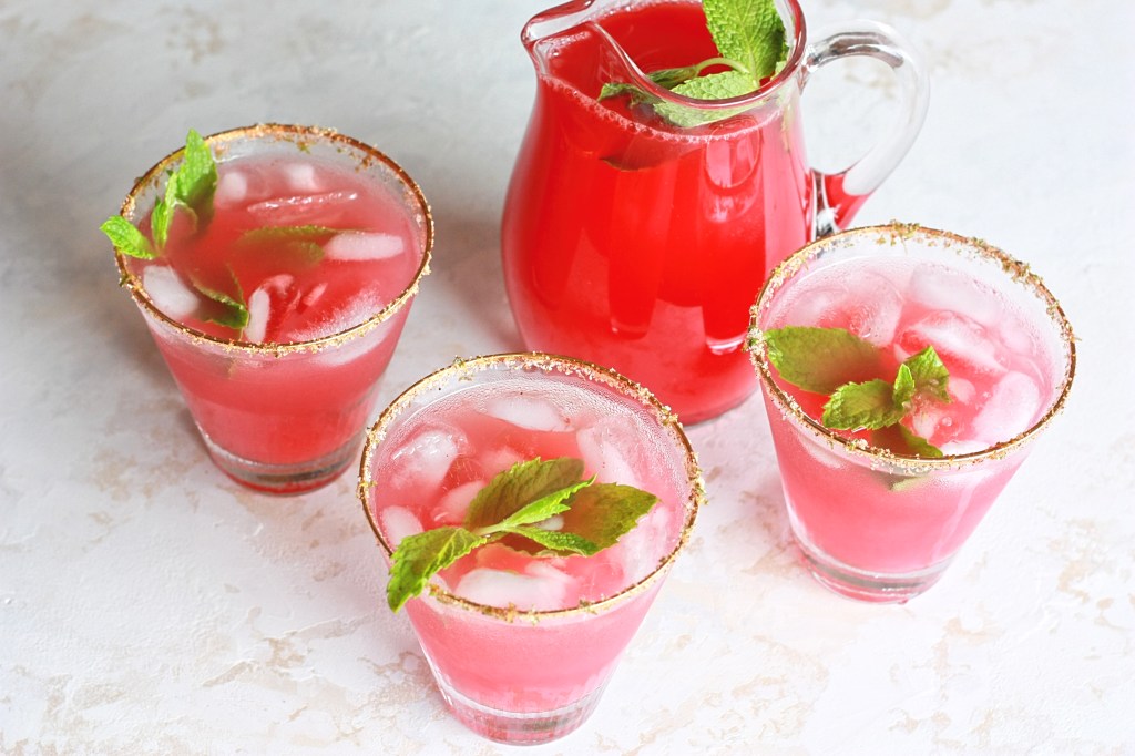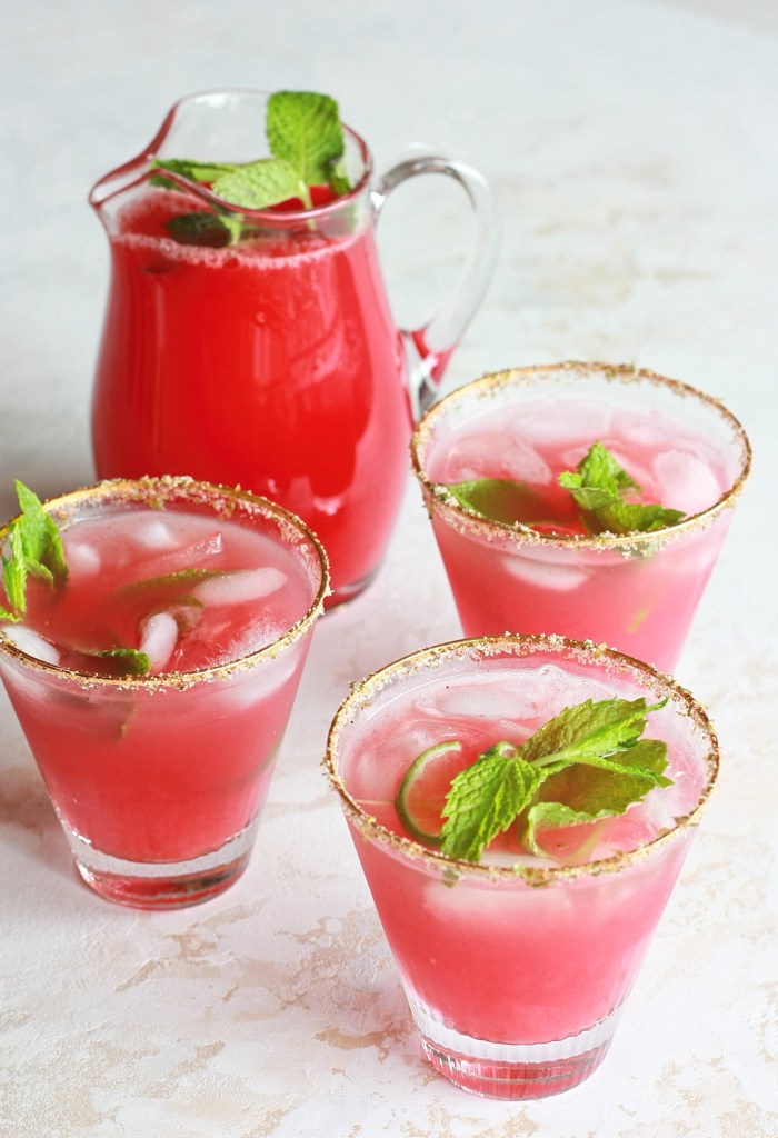 4. To assemble one glass of watermelon limeade: Wet the rim of a cocktail glass with water or a lime wedge. Dip the rim in the salt so the salt sticks to the rim. Put a handful of ice cubes in the prepared cocktail glass. Stir together the watermelon juice and lime juice and pour over the ice cubes. Garnish with a mint sprig and lime wedge. Drink immediately.