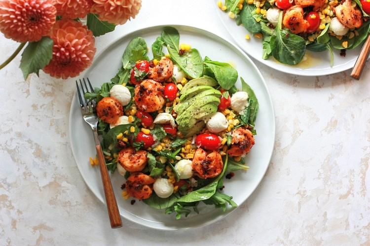 summer green salad with chili-lime prawns, corn, and tomatoes