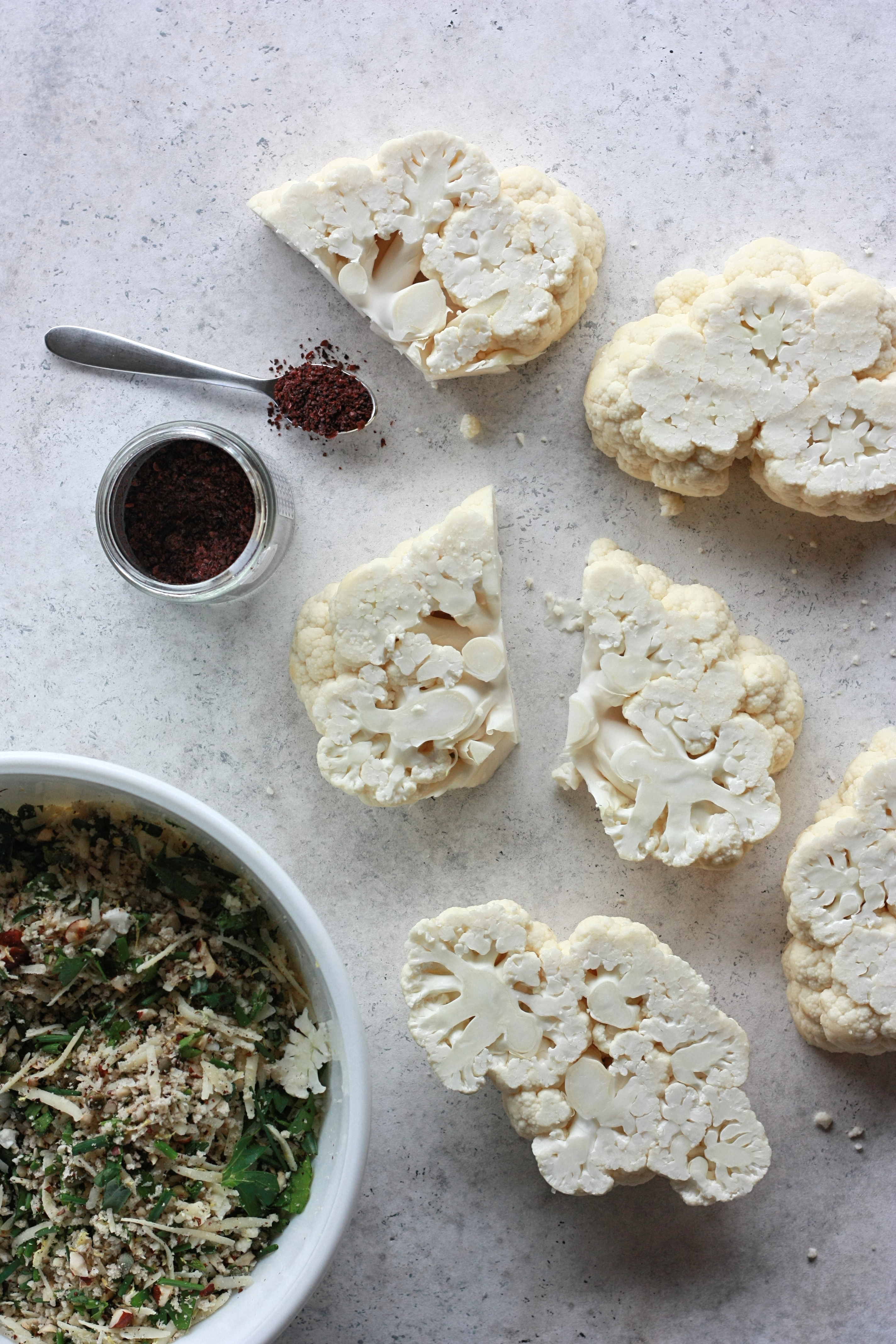 CAULIFLOWER HALF-STEAKS WITH HAZELNUTS, SUMAC, GRUYERE, AND LEMONY HERBS