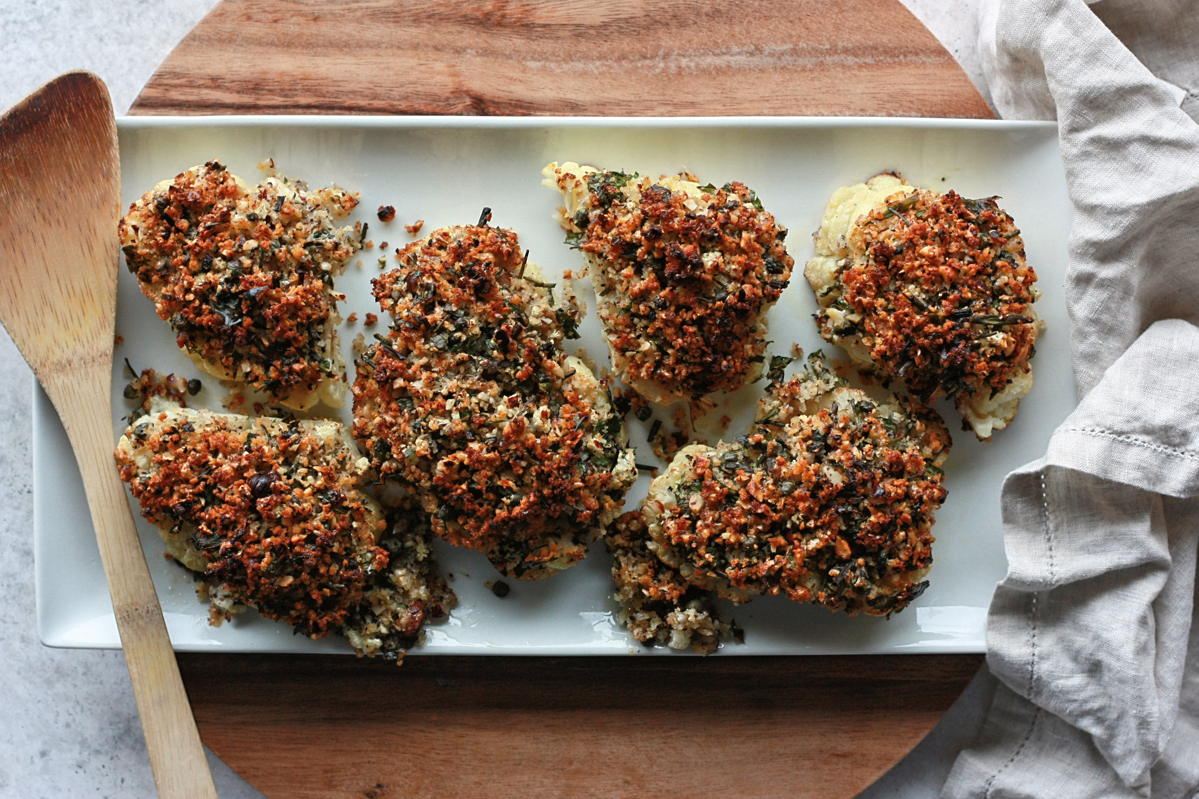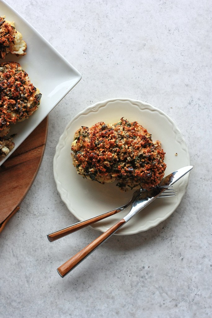 4. Second bake: After the first bake, pull the cauliflower out of the oven and generously top each steak with the prepared topping (do not remove the steaks from the baking sheet, they are going back in the oven). It will seem like you have too much topping, but keep adding more, until all of the topping has been used. Some of the topping will fall onto the baking sheet, which is perfectly fine. Put the steaks back in the oven and bake for another 15 minutes, or until the topping has turned a deep golden brown. I recommend serving the cauliflower steaks warm, after they have cooled for a few minutes. Any leftovers will keep for another day or two, just re-toast them before eating.