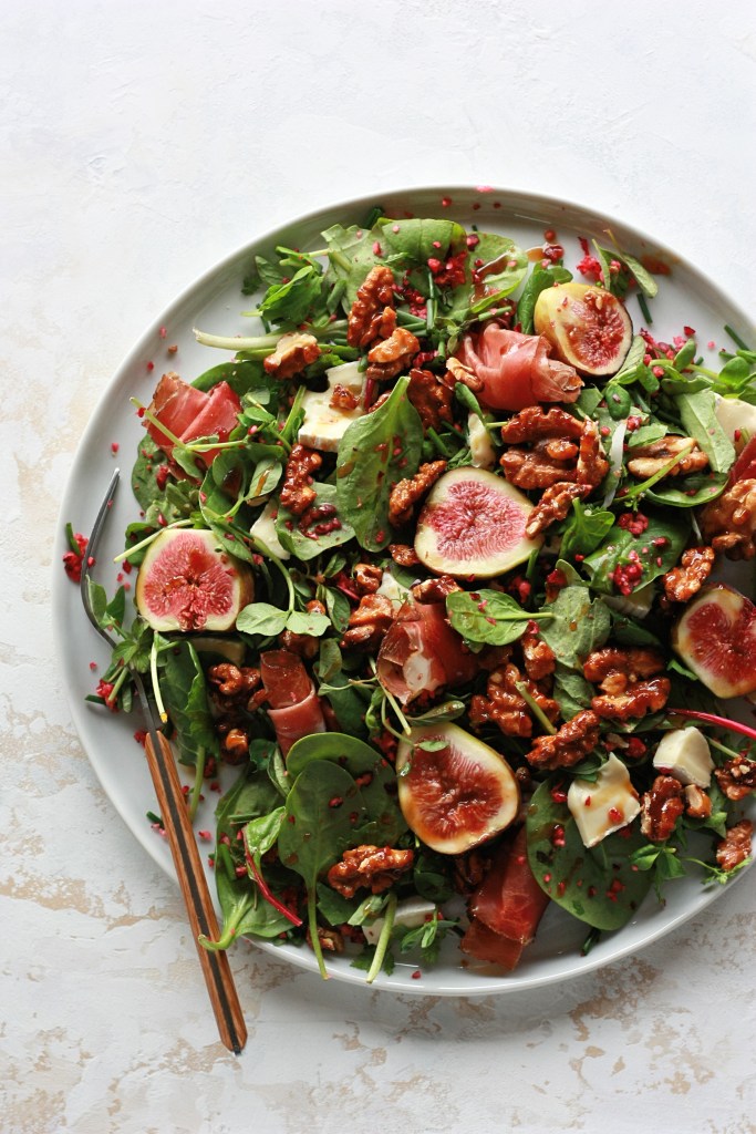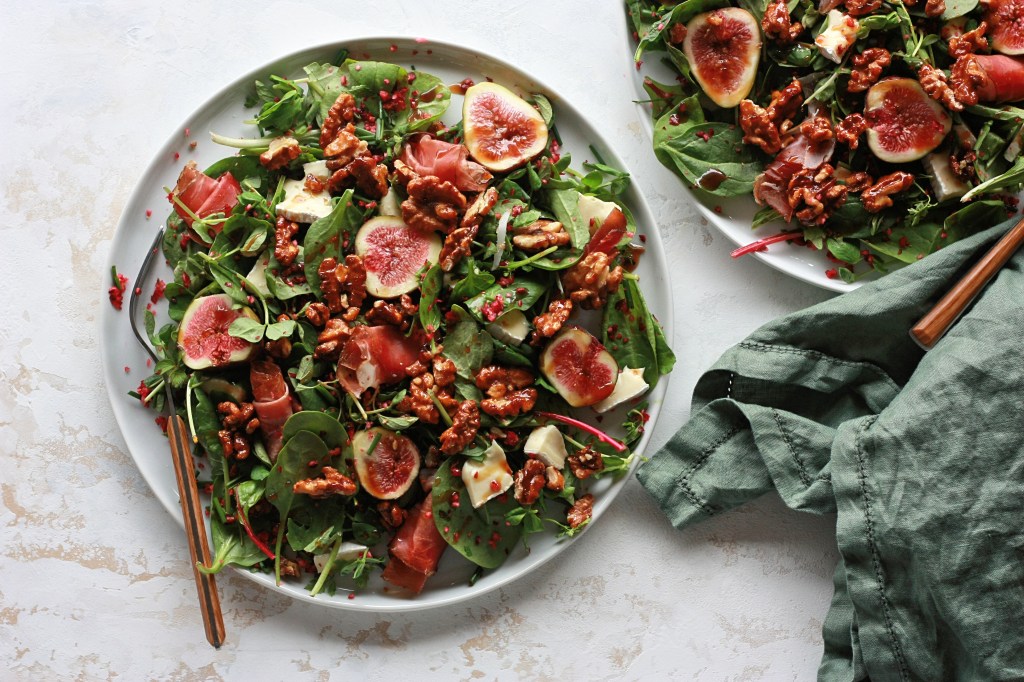 4. Gently toss together the greens, herbs, and blitzed cranberries in a large bowl. Add some of the balsamic honey dressing, toss a few times, then give it a taste and add more dressing if needed. Serve the greens onto either 2 large entree plates or 4 salad plates. Top each salad equally with the brie, figs, speck, and spiced walnuts.