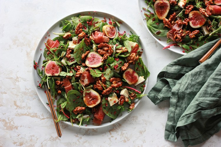 4. Gently toss together the greens, herbs, and blitzed cranberries in a large bowl. Add some of the balsamic honey dressing, toss a few times, then give it a taste and add more dressing if needed. Serve the greens onto either 2 large entree plates or 4 salad plates. Top each salad equally with the brie, figs, speck, and spiced walnuts.