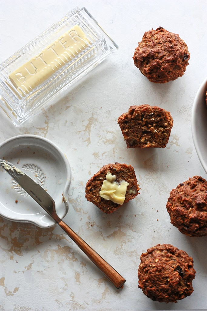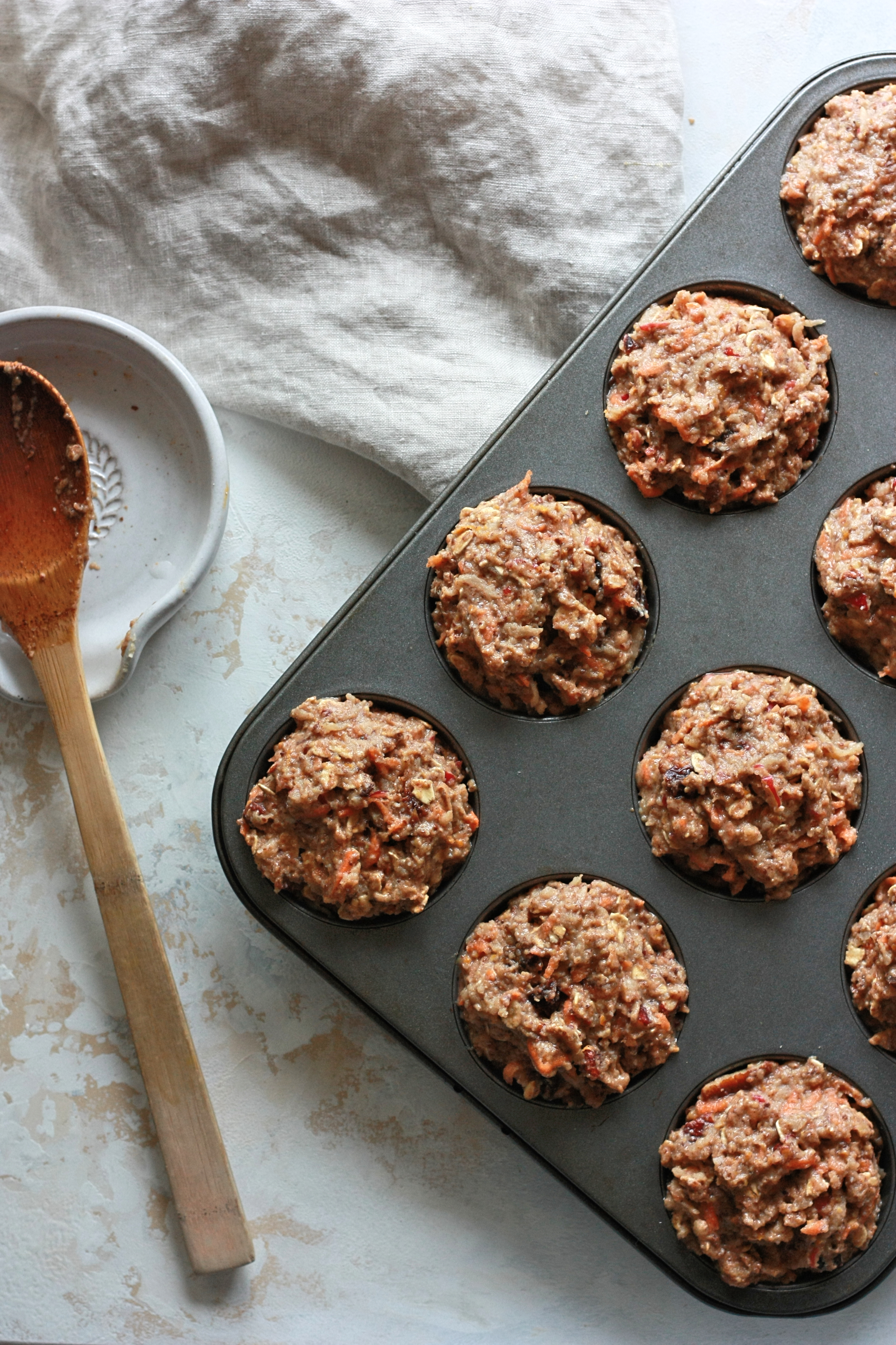 I am not above eating cake for breakfast (with a hot cup of coffee, of course) and certainly not above eating cake masquerading as a muffin. But in all seriousness, these are not cake, yet I find them equally hard to resist. Whole wheat flour, oats, ground flaxseeds, and wheat germ are the delicious and hearty base of these muffins with no added granulated sugar, albeit some honey and applesauce to sweeten them slightly. I love them freshly baked from the oven, especially with a bit of butter or jam. My two year old daughter likes them as well, but she only takes a couple bites before licking all the jam off and asking for more jam (toddlers, right?). Regardless of who is present to eat them, they never last long and I’m always regretting I didn’t make a double batch. Do not let the long ingredient list dissuade you, it’s an easy “mix everything together” type of recipe.