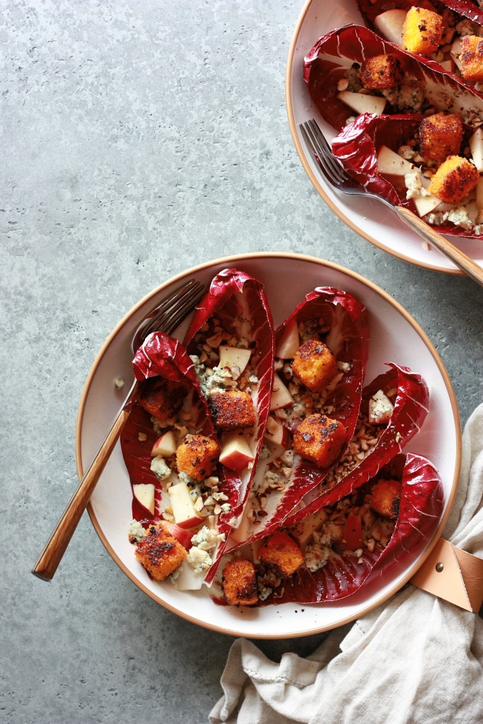 3. Assemble salad: Rinse 10 large radicchio leaves in cold water and pat dry. Add the radicchio to the bowl with the salad dressing. Very gently toss the radicchio with your hands until all the leaves are coated. Place 5 radicchio leaves on each of two large plates. Evenly distribute the apple, hazelnuts, blue cheese, and cornbread croutons onto the radicchio. If desired, drizzle any remaining dressing over the salads.
