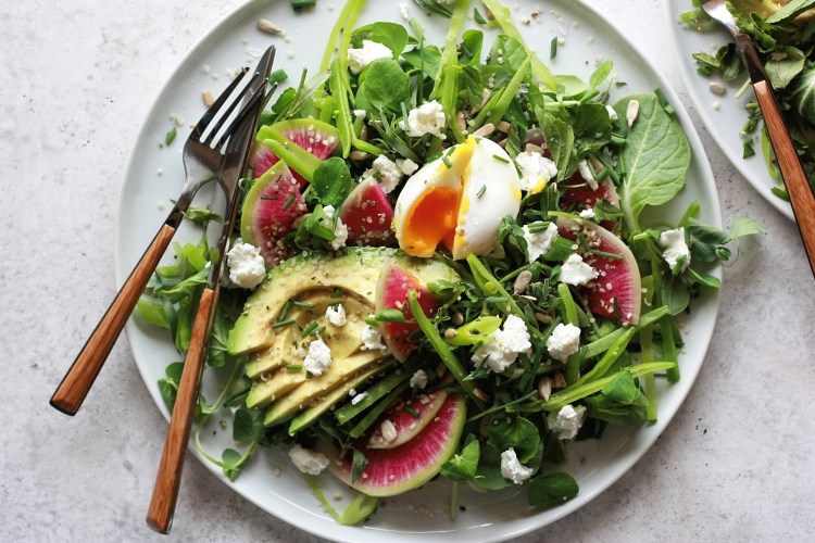 ENDIVE SALAD “SLIDERS” WITH CRAN…GREEN SALAD WITH PRAWNS, CORN…BLT BREAKFAST SALADHEIRLOOM CAPRESE SALADMELON AND FETA SALAD…BRUSSELS SPROUT, APPLE, CRAN….CORN, ZUCCHINI, HALLOUMI, AND…EASY PARMESAN GREEN SALADSTONE FRUIT SALAD